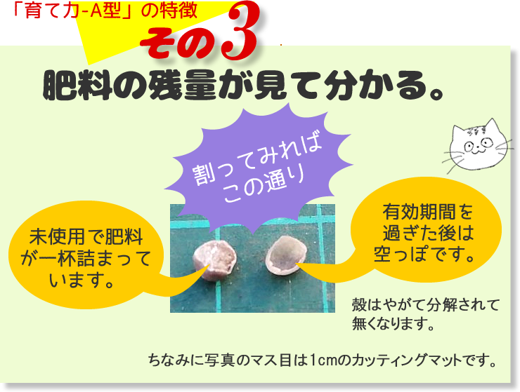 一般的に固形肥料は、成分がすっかり溶け出してもも外見は変化せず、、肥料が切れたかどうかははっきり分かりません。しかしコーティング肥料は写真の通りカッターかハサミで割ってみれば「一目瞭然」、肥料がなくなると空っぽになっています。とても分かりやすいですね。