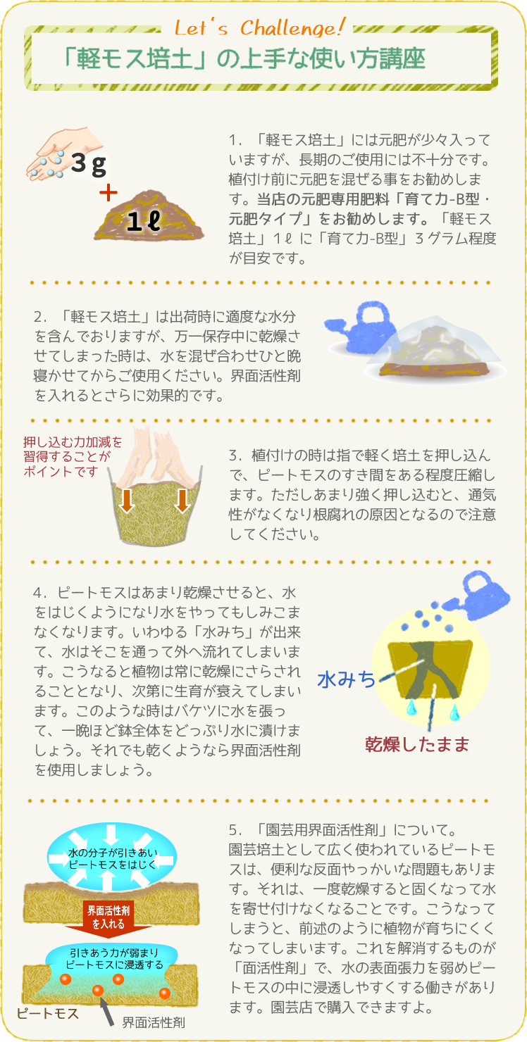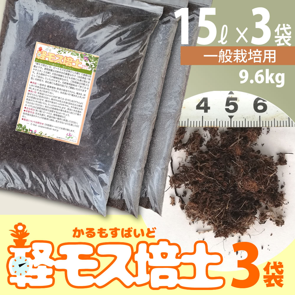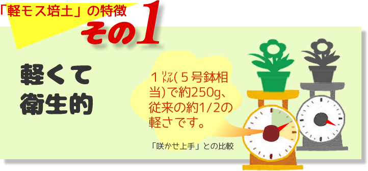 「軽モス培土」は、ピートモスを主体とした軽くて清潔な培養土です。通常培養土の約半分の重量ですので(当店商品「咲かせ上手」と比較)、女性でも楽に扱えます。さらに培土量の多い大型の鉢植えにはその威力を発揮します。また、すべてが植物由来ですので、ご利用後は可燃ゴミとして処分していただけます。元肥専用肥料の「育て力-B型」の併用で、初心者でも安心してお使いいただけます。